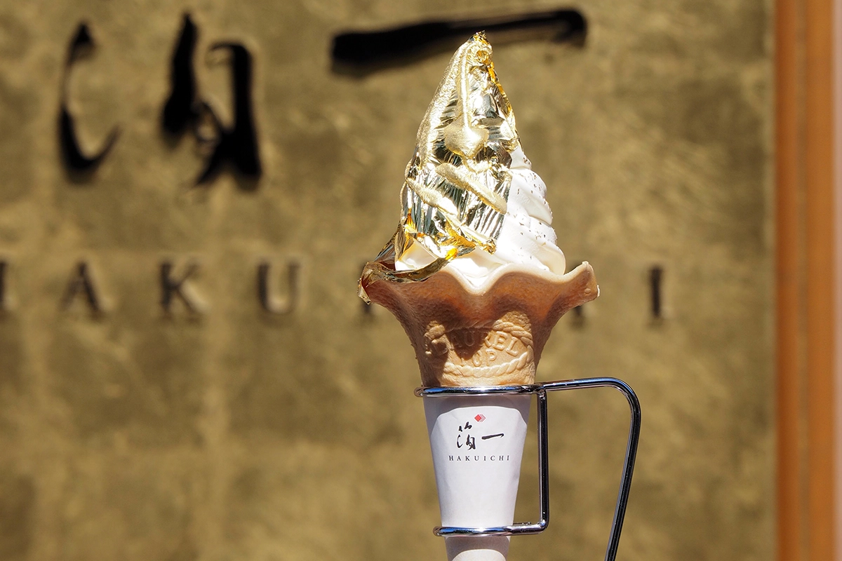 Hakuichi isn’t just any ice cream shop; it’s a celebration of all things gold leaf. Here, they take their local specialty to a whole new level. Did you know Kanazawa produces a whopping 98% of Japan’s gold leaf? That’s a lot of bling! And at Hakuichi, they don’t hold back in showing off this local craft.